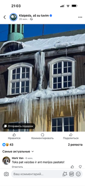 Клайпедчане активно обсуждают эту проблему в соцсетях. Но изменений к лучшему, если судить по количеству и размрам сосулек, пока не очень много.