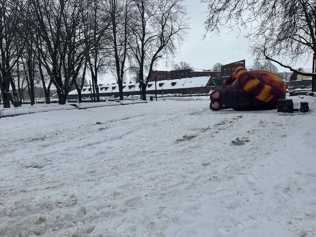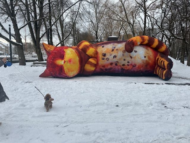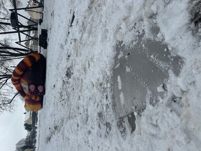 Сегодня, вечером 19 февраля, в Клайпеде начинается фестиваль Света. Некоторые инсталляции уже готовы. Но хочется, чтобы праздник принёс радость, а не травмы. В сквере у Данес, на месте летнего фонтана,, расположился лежачий кот. А рядом с фигурой под снегом - металлические пластины, очень скользкие. И они не видны.