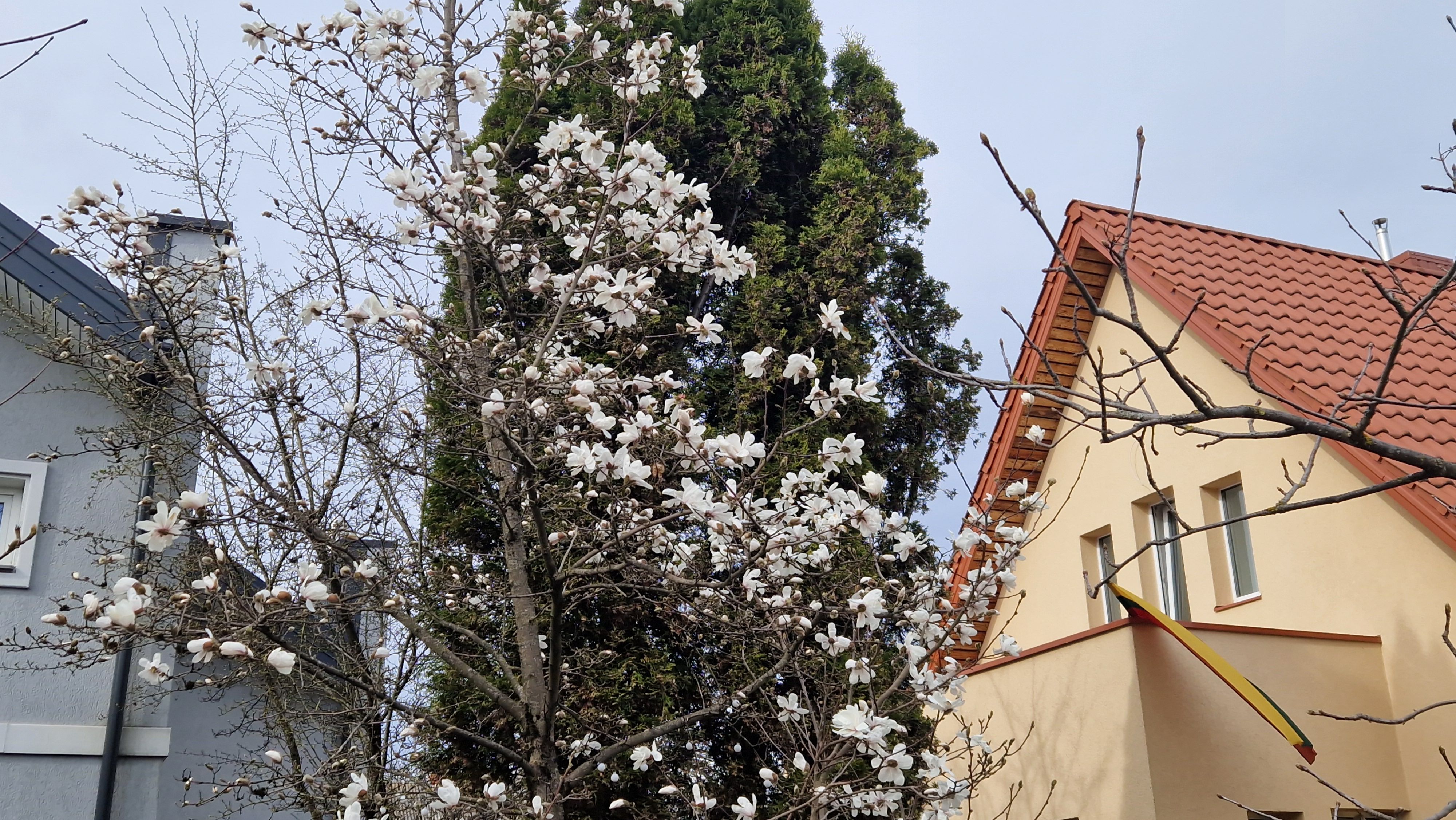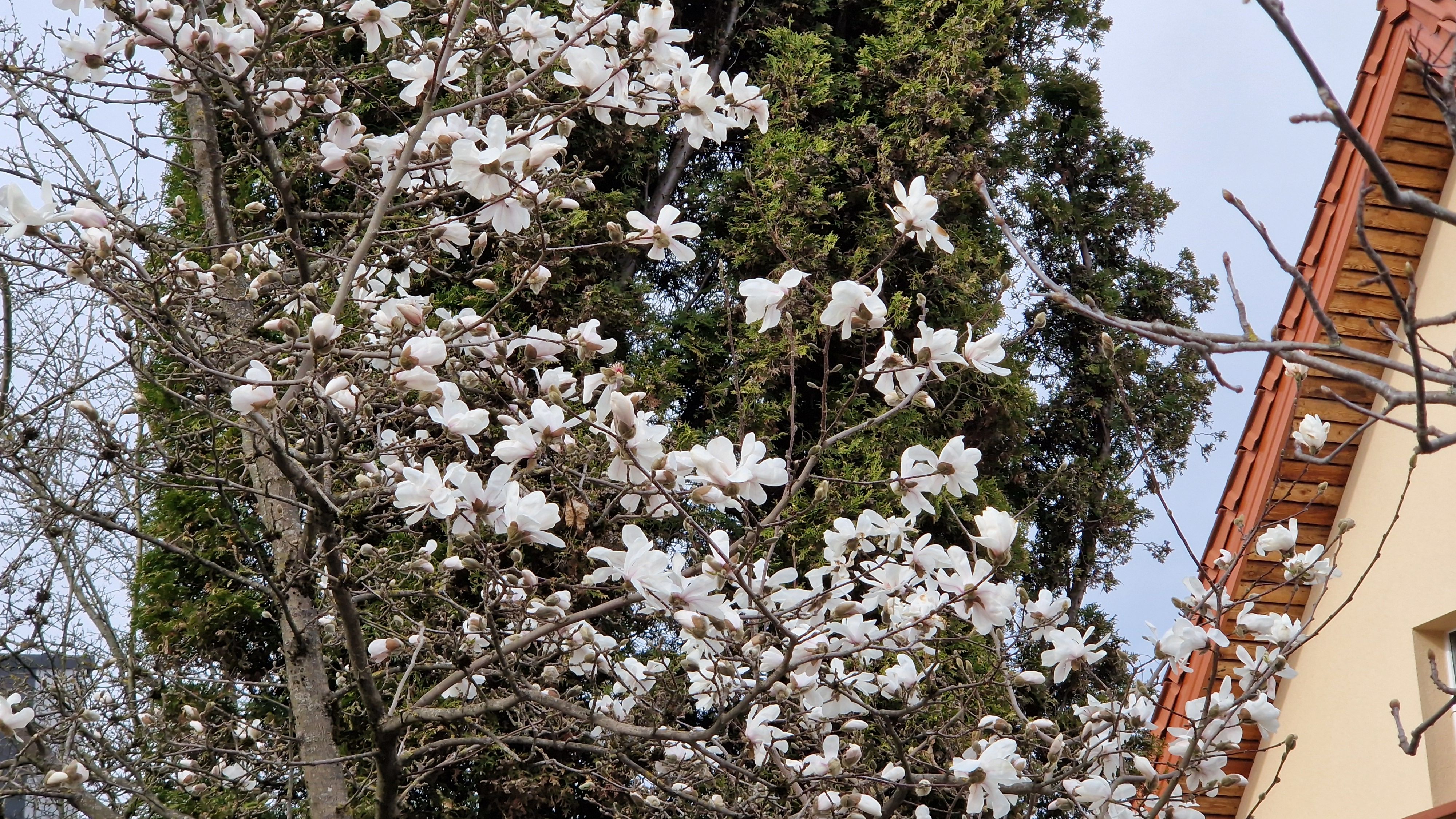 Оказывается, у нас уже буйно цветут некоторые деревья. Правда, совершенно непонятно, что это за деревья - слишком уж велики цветки для обычной вишни, яблони или что там уна сещё цветет подобным образом.